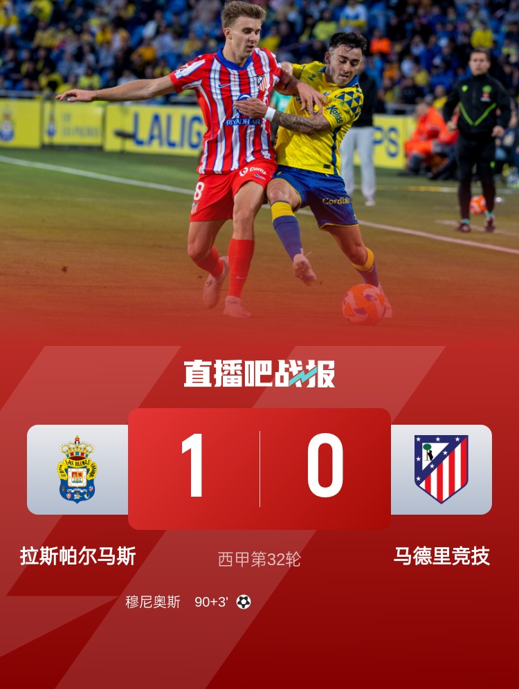 西甲联赛第32轮,马竞客场0-1遭拉斯帕尔马斯绝杀,落后巴萨10分。