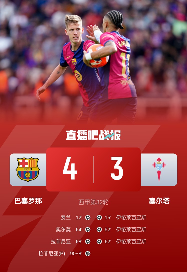 西甲联赛第32轮,巴塞罗那连进三球4-3塞尔塔,奥尔莫造点,拉菲尼亚点射绝杀,伊格莱西亚斯帽子戏法。