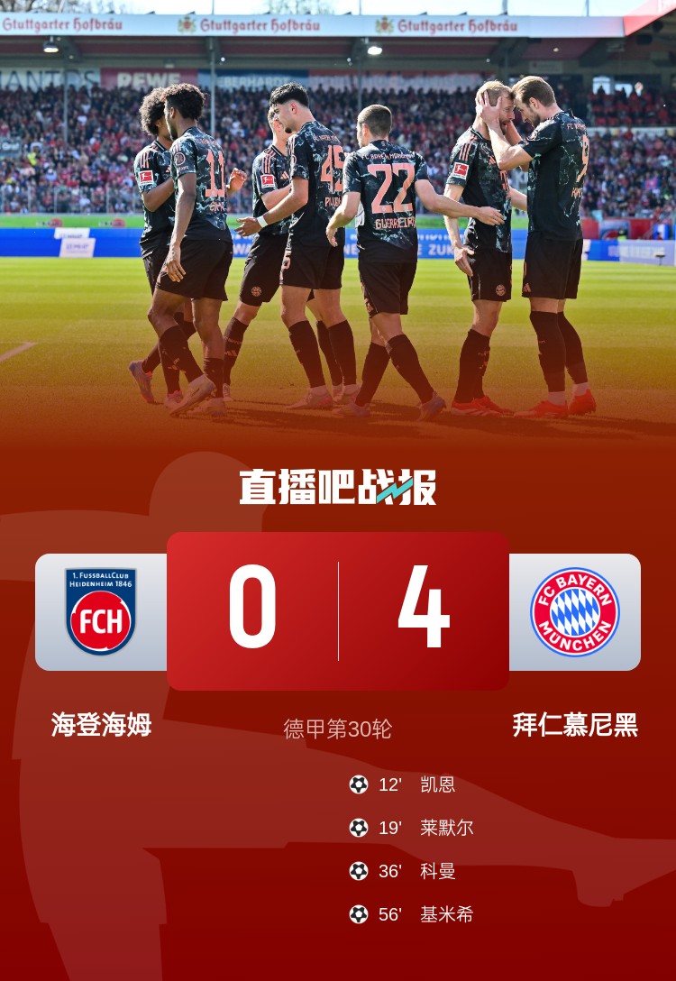 德甲第30轮,拜仁客场4-0大胜海登海姆,凯恩、莱默尔、科曼、基米希进球。